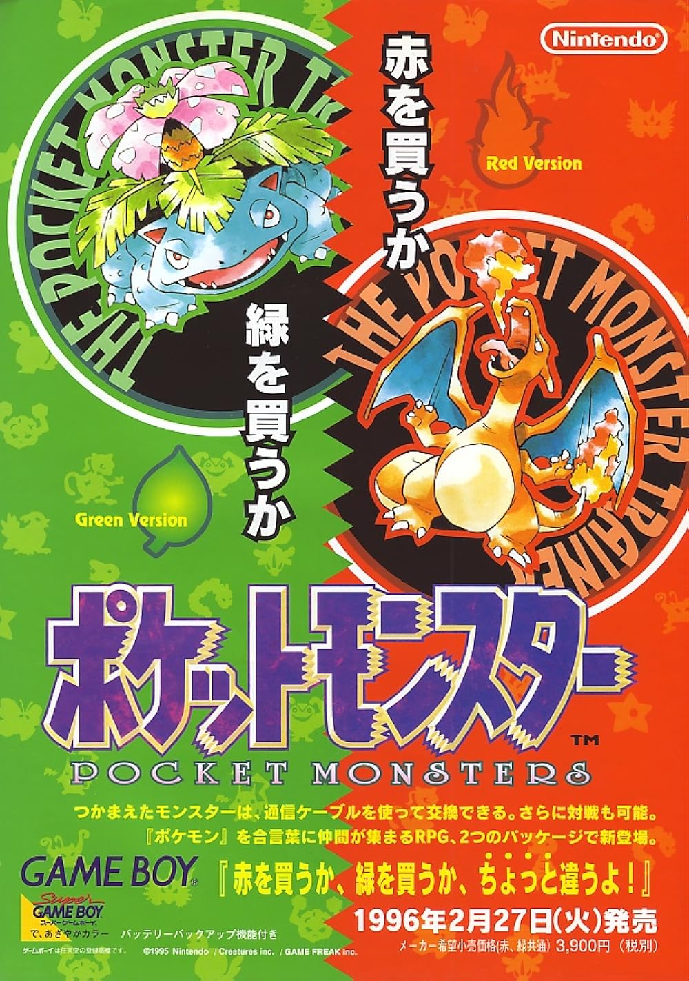 Alors que la Game Boy continue d’exister avec une ludothèque très riche dont moult portages 8-bit et adaptations 16-bit, l’arrivée de la cinquième génération de consoles fin 1994 va quelque peu essouffler son nombre de sorties. C’était sans compter le studio Game Freak sous la direction de Satoshi Tajiri, qui va littéralement bouleverser le monde vidéoludique le 27 février 1996 avec la sortie du tout premier Pokémon, RPG au tour par tour consistant à capturer cent cinquante espèces de créatures afin de les faire combattre et devenir le meilleur dresseur de la région. Un système largement inspiré de Dragon Quest V, d’où sont d’ailleurs tirés les Dragon Quest Monsters sur Game Boy Color, spécialisés dans les combats de monstres. Le jeu a la particularité de sortir en deux versions, d’abord une Rouge et une Verte, certains Pokémons étant exclusifs à chaque itération pour obliger le joueur à recommencer une partie sur l’autre s’il veut tous les capturer, et afin de favoriser les échanges et les combats de Pokémons entre deux Game Boy via le câble link. Pokémon sort plus de trois ans et demi plus tard en Europe dans des versions Rouge et Bleue, cette dernière étant également sortie au Japon. La saga a amené de nombreux produits dérivés comme des cartes à jouer, des figurines et des peluches, mais surtout une très sympathique série animée reprenant les événements du jeu avec un héros nommé Sacha et son Pokémon Pikachu. Cette dernière a plus tard amené à la sortie d’une version Jaune n’ayant pas les mêmes Pokémon exclusifs, octroyant Pikachu comme premier Pokémon et améliorant grandement le design de certaines créatures.