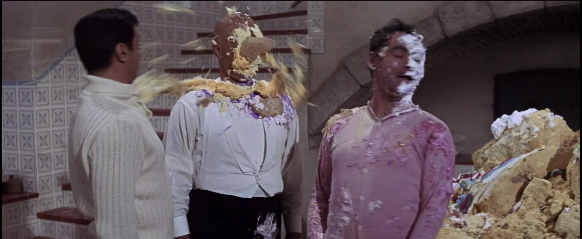 Sur des airs de Bach et une musique originale virevoltante de Mancini qui s’est amusé à remixer des airs patriotiques ronflants, cette comédie emporte l’adhésion, proche par son traitement des Merveilleux Fous volants dans leurs drôles de machines de Ken Annakin (1965), autre comédie à grand spectacle avec une pluie d’étoiles au casting. Entre quiproquos, pièges machiavéliques et duel à l’épée, l’œuvre culmine avec la très fameuse scène des tartes à la crème : 2357 tartes à 7 parfums différents – un record – que se balancent allègrement les protagonistes dans une séquence culte qui a nécessité 5 jours de tournage (pour environ 4 minutes à l’écran). Bien que fondée sur des ressorts comiques dépassés aujourd’hui, elle est encore vraiment irrésistible.