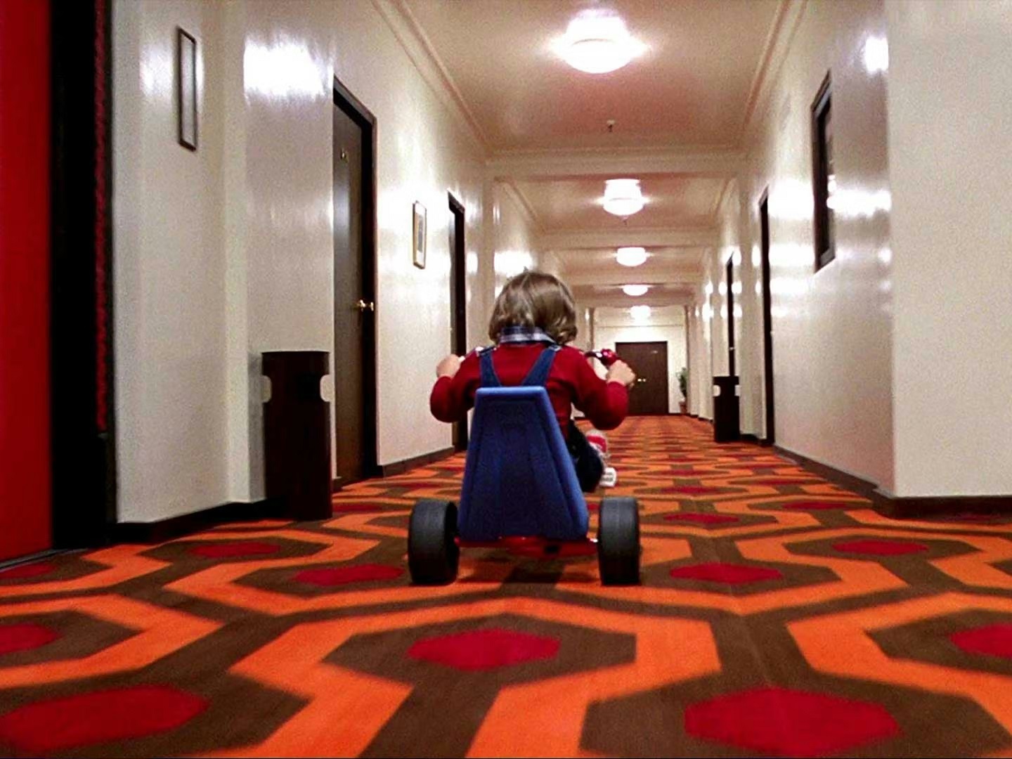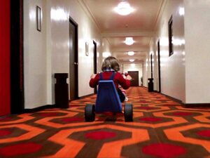 Très librement adapté du roman Shining L’Enfant Lumière de Stephen King, le film s’inscrit dans la lignée de classiques comme Rosemary’s Baby et L’Exorciste en intégrant les concepts de la maison isolée et hantée, du personnage qui sombre dans la folie et des perceptions extrasensorielles. S’il ne cherche pas spécialement à faire peur, il mise sur une ambiance angoissante appuyée par une qualité de réalisation hors pair. Aux magnifiques plans de l’hôtel viennent s’ajouter des scènes filmées à hauteur d’enfant durant lesquelles Danny déambule dans les couloirs à bord de son tricycle, ainsi qu’un dédale spatio-temporel matérialisé par un labyrinthe végétal.