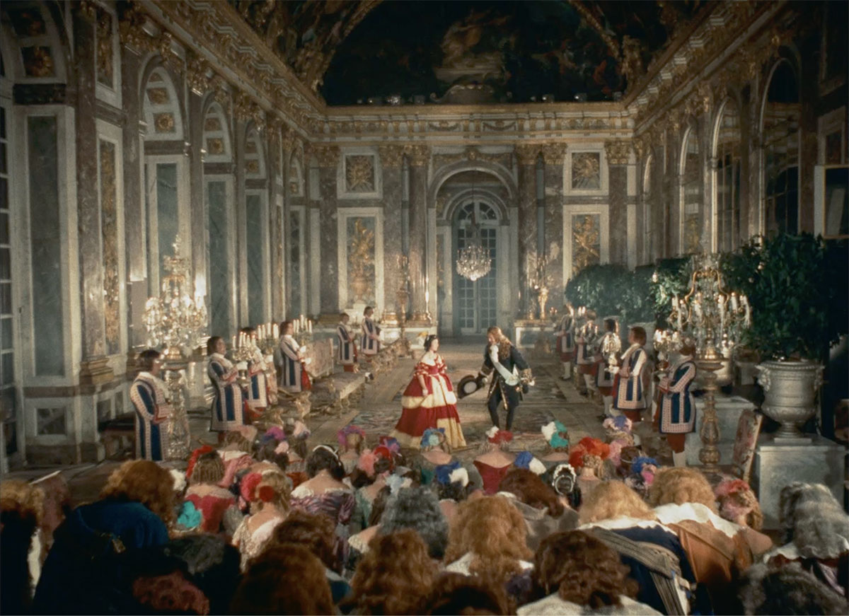 Très vite, on comprend qu’il va prendre soin du château (le plus beau du monde, on vous le répète, et il prend soin de l’asséner régulièrement) comme des personnages – on le sent plein de complaisance envers Louis XIV, et sa discrétion quant à Napoléon (qui refusa de dormir dans le lit du roi) peut s’expliquer par le fait qu’il avait sans doute déjà le projet d’un film sur lui. Cependant, le procédé ne fait malheureusement guère honneur aux décors : les plans fixes, souvent cadrés sur un groupe dans une salle (assis à un bureau, sur un divan, debout à causer dans un coin) et à hauteur d’homme laissent peu de place aux statues, dorures, toiles, tapisseries et surtout aux jardins qu’on voit finalement très peu. Alors que la restauration en 4K est absolument phénoménale, faisant ressortir comme jamais les soieries (le bleu des robes et des tenues royales est somptueux) et les bijoux, boostant les couleurs, on se rend compte aussi des ravages du temps sur Versailles : les balustrades abîmées, les dallages écaillés ou décollés, les dorures des grilles presque effacées ne rendent pas hommage à la splendeur de ce berceau de notre Histoire.