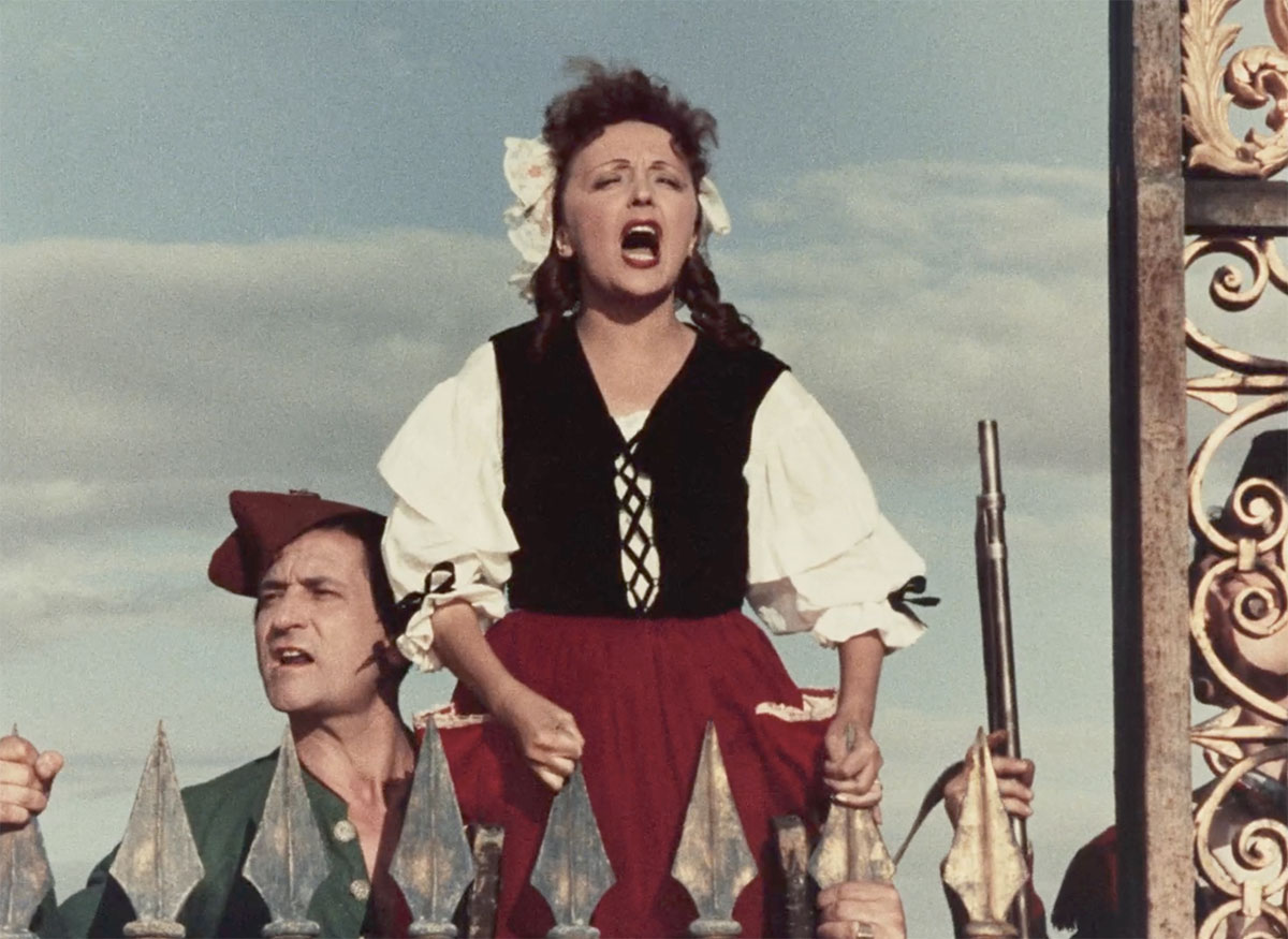Cela commence par un banc-titre plein de malice dans lequel les collaborateurs de Guitry sont chaudement remerciés. Puis l’homme apparaît à l’écran et s’assoit devant un bureau, ouvrant un livre imposant portant le titre du film, tout en parlant avec sa voix légèrement grinçante où percent une ironie perpétuelle et une sorte de détachement un peu snob. Les pages nous montrent la distribution, qui s’avère exceptionnelle : même si les grandes heures d’Hollywood ont mis à l’écran des productions constellées de stars, la densité du casting de celle-ci semble très difficile à égaler. Que Sacha Guitry interprète Louis XIV (vieux, le monarque ayant droit d’ailleurs à trois acteurs pour différentes périodes de sa vie), cela tombe sous le sens et colle parfaitement à ce qu’on sait de l’artiste. Mais je vous laisse parcourir la liste (non exhaustive) des comédiens engagés, dont certains étaient à peine connus (il s’agit du premier rôle d’Annie Cordy par exemple, et sans doute l’un des tout premiers de Brigitte Bardot) et d’autres au faîte de leur gloire, quand d’autres encore sont venus par habitude. L’image d’Edith Piaf en sans-culottes chantant une version moderne de Ah, ça ira ! est fort connue, mais on sait moins que Tino Rossi interprète un gondolier (lors d’une de fêtes nautiques au palais), Bourvil un guide de musée un peu nostalgique, Gino Cervi un Cagliostro facétieux, Gérard Philipe un D’Artagnan en colère sans parler d’Orson Welles dans la peau de Benjamin Franklin ! Et on n’en a pas fini… S’il n’y a pas Fernandel, c’est sans doute en raison d’une terrible brouille entre eux à propos d’un film écrit par Guitry mais réalisé par l’acteur comique, qui les a menés devant les tribunaux.