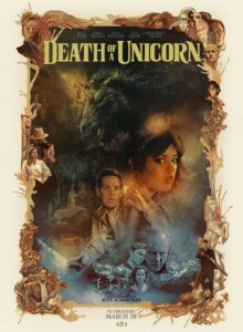 Le film nous fait clairement comprendre que cette famille, sont réellement les mauvaises personnes du film et non ces licornes. Le film pointe avec humour, la nocivité des entreprises pharmaceutiques, et comment elles tirent profit a chaque occasion qui se présente. Les licornes ont un rendu plutôt réussi, mais qui sont loin de qu’on peut imaginer, car parfois elles ont l’apparence de monstres. Paul Rudd et Jenna Ortega jouent Elliot et Ridley, le père et la fille. Will Poulter jour Shepard le fils de la famille, Richard E. Grant interprète Odell le doyen de la famille et Téa Leoni joue Belinda la femme d’Odell et mère de Shepard. Death Of a Unicorn, n’aura donc pas de sortie cinéma en France , mais une sortie VOD c’est déjà ça.