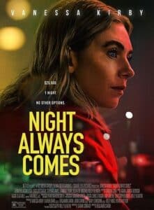 Le réalisateur Britannique Benjamin Caron livre son deuxième long-métrage après Sharper en 2023, sur la plate-forme Apple TV et produit par A24. Cette année c’est sur Neflix que le réalisateur revient avec Night Always Comes, un thriller avec Vanessa Kirby vu dernièrement également dans Les 4 fantastiques. Dans ce thriller elle joue une femme, menacée d’expulsion qui doit trouver 25 000$, elle a une nuit pour les avoirs au matin. Elle prend des risques, parfois trop gros qui pourraient lui valoir des énormes problèmes, ce qui sera d’ailleurs le cas. Night Always Comes, est un film ou tout peut arriver, mais c’est aussi un film qui prend trop son temps, et ce n’est pas très qualitatif.