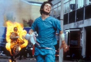 La gestion militaire donne également l’occasion de dénoncer l’impuissance des structures politique face à un ennemi invisible, les décisions expéditives de l’armée et les dilemmes moraux qui en découlent. Rose Byrne (Star Wars L’Attaque des Clones, Troie, Sunshine) y incarne à cette occasion une médecin militaire confrontée à l’échec de la science face au virus, tandis que Jeremy Renner (Démineurs, Missions Impossible Protocole Fantôme, Hansel et Gretel Chasseurs de Sorcières) interprète un sniper qui déserte l’armée pour sauver une partie de la population. Moins intimiste que 28 Jours Plus Tard, sa suite mise sur l’ampleur et la brutalité d’un effondrement en cours, le réalisateur ayant conservé la tension sourde qui faisait la force du premier film. Entre film d’horreur postapocalyptique et critique militaire, 28 Semaines Plus Tard confirme l’intérêt d’un univers où le virus n’est qu’un révélateur des instincts humains les plus sombres.