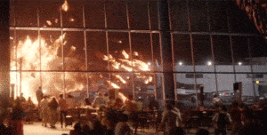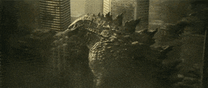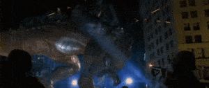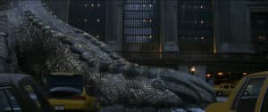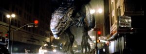 Le réalisateur imagine à sa façon le monstre, il ne défend pas les humains mais se contente de détruire New York. Les humains quant à eux ne cherchent pas plus loin, et cherchent à l’éliminer mais rien n’y fait. Le monstre est bien fichu, dans l’ensemble il s’agit d’un lézard géant. Le générique nous explique vaguement le pourquoi du comment. Il s’agit d’essais atomiques, qui font grandir un reptile, et ce dernier gigantesque détruit tout quand il est hors de l’eau. Le monstre rend toujours aussi bien, mais ne reste pas une icône comme l’original. Emmerich se démarque, et fait sa propre version. Dans le film, Godzilla se bat contre les humains, et les humains lui balancent ce qu’ils peuvent même des tirs de missiles. En gros Emmerich fait de Godzilla, un gros dinosaure, qui détruit tout et quand il détruit tout surtout c’est pour échapper aux tirs des humains. Car les plus gros des dégâts, ne sont pas provoqué que par le monstre, mais en majorité par les humains car ils ne sont pas foutus de tirer des missiles correctement et dégomment leur propre immeuble. Bon Godzilla est une cible mouvente, me direz-vous, le monstre ne se déplace, pas à grande vitesse, ils auraient pu réussir beaucoup plus de tirs. Au vu de l’ensemble du long-métrage, il semble qu’Emmerich ridiculise l’être humain.